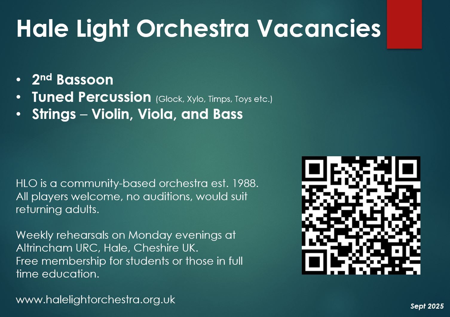HLO rehearsals are held at Altrincham United Reformed Church Hall every Monday evening from 7:45-9:45 pm. The hall has recently been refurbished/modernised is very warm and comfortable for rehearsals. Interval refreshments during rehearsal.