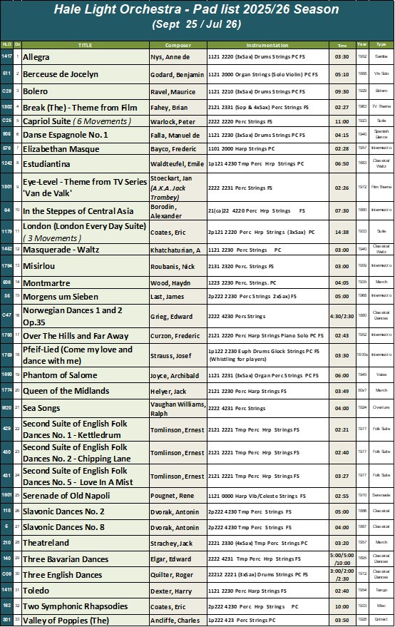 HLO pad list for the 25/26 season is packed full of both popular and extremely rare music, some of which have never been heard or played in public or broadcast / recorded for many years. These have been transcribed from the originals by our excellent HLO Librarian.This year we have a number of pieces rescued from the archive "including:"